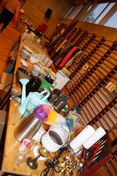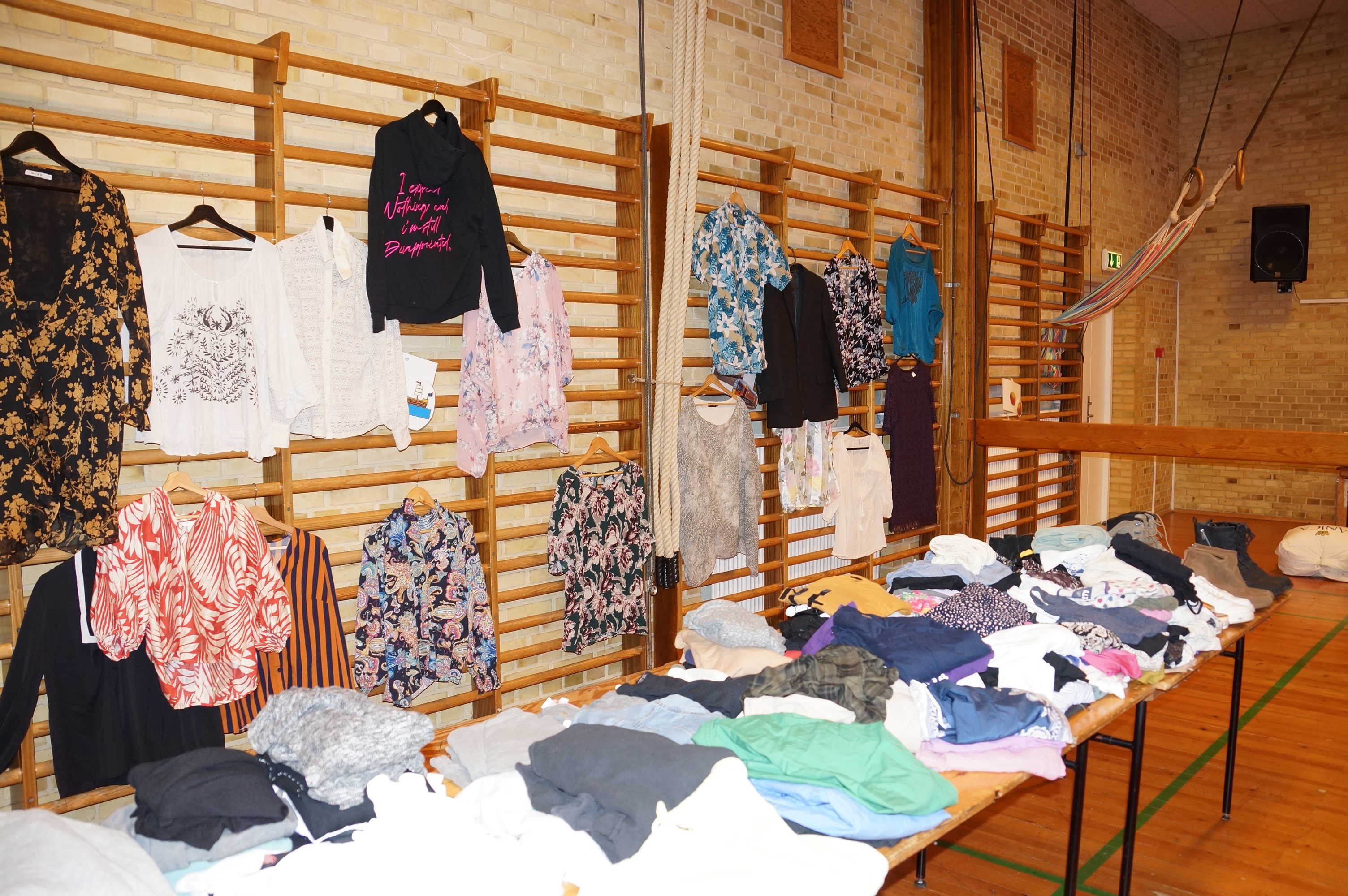Bordene bugnede af tøj doneret af både elever og personale, og derudover var der også et udvalg af køkkenudstyr, badeartikler og andre ting, som var blevet givet til STU Randers.