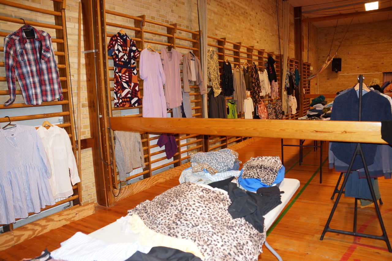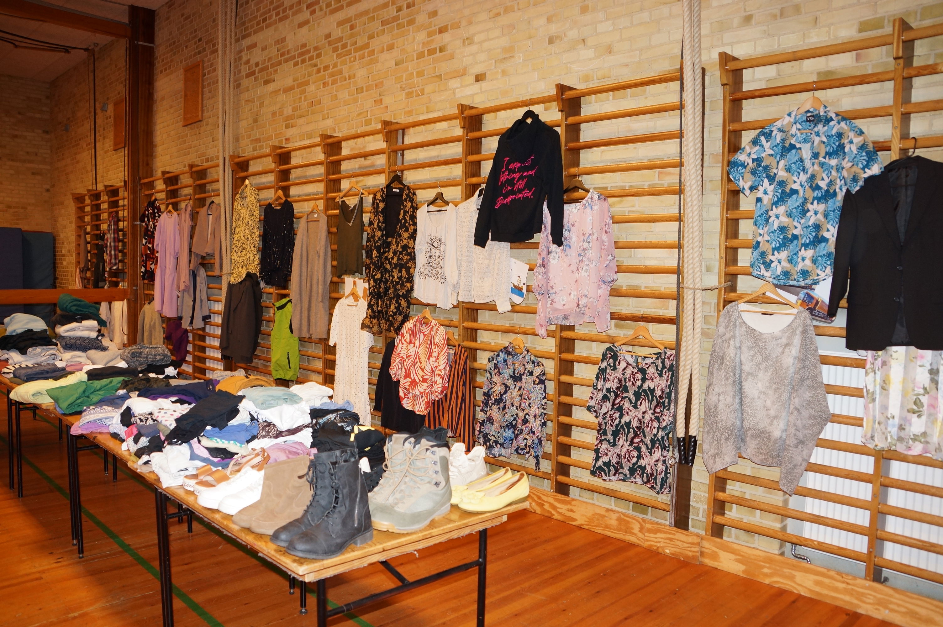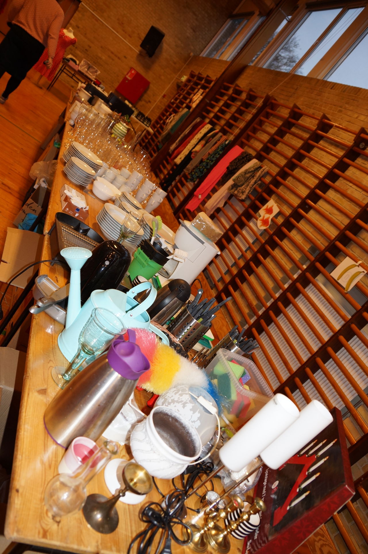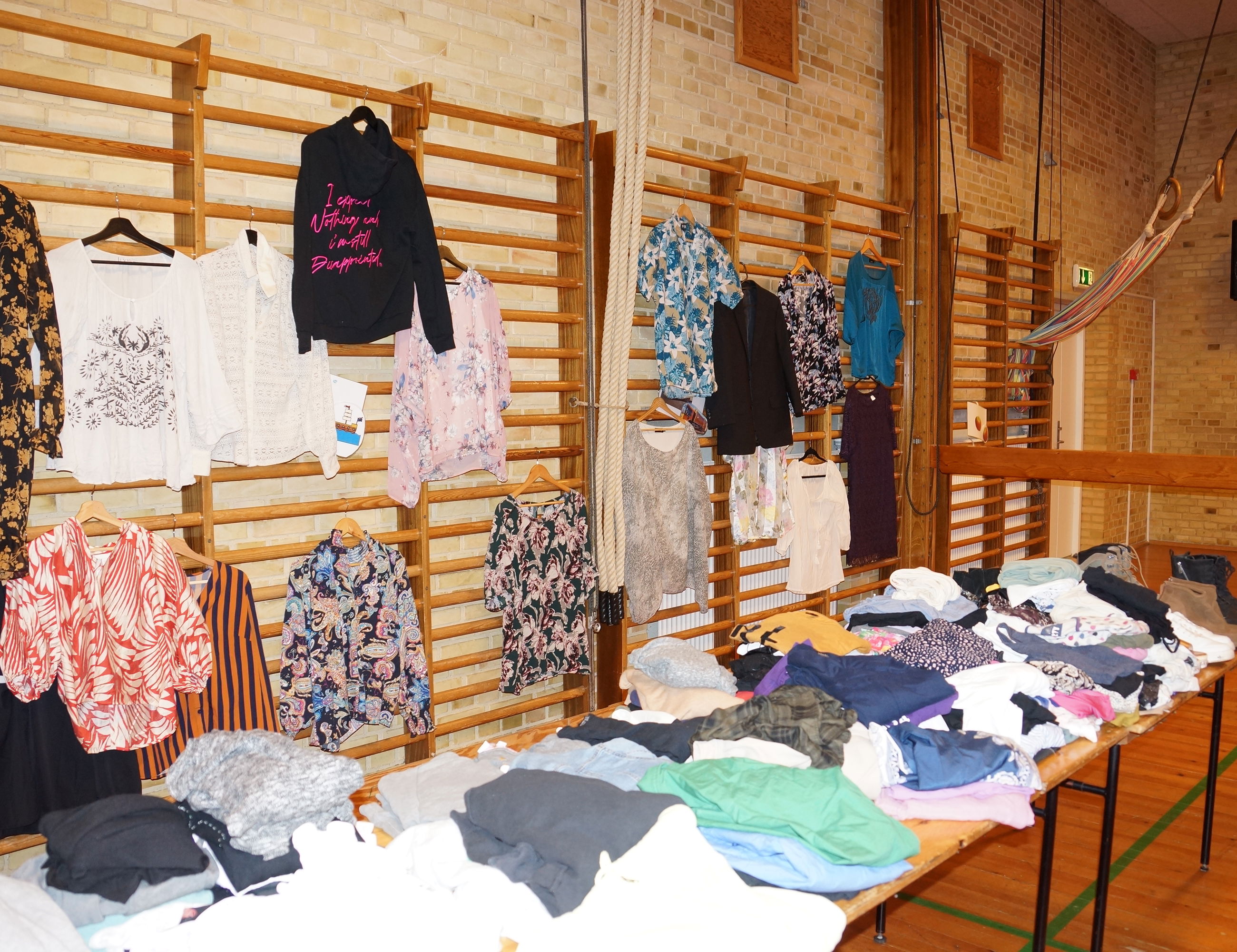 Bordene bugnede af tøj doneret af både elever og personale, og derudover var der også et udvalg af køkkenudstyr, badeartikler og andre ting, som var blevet givet til STU Randers.